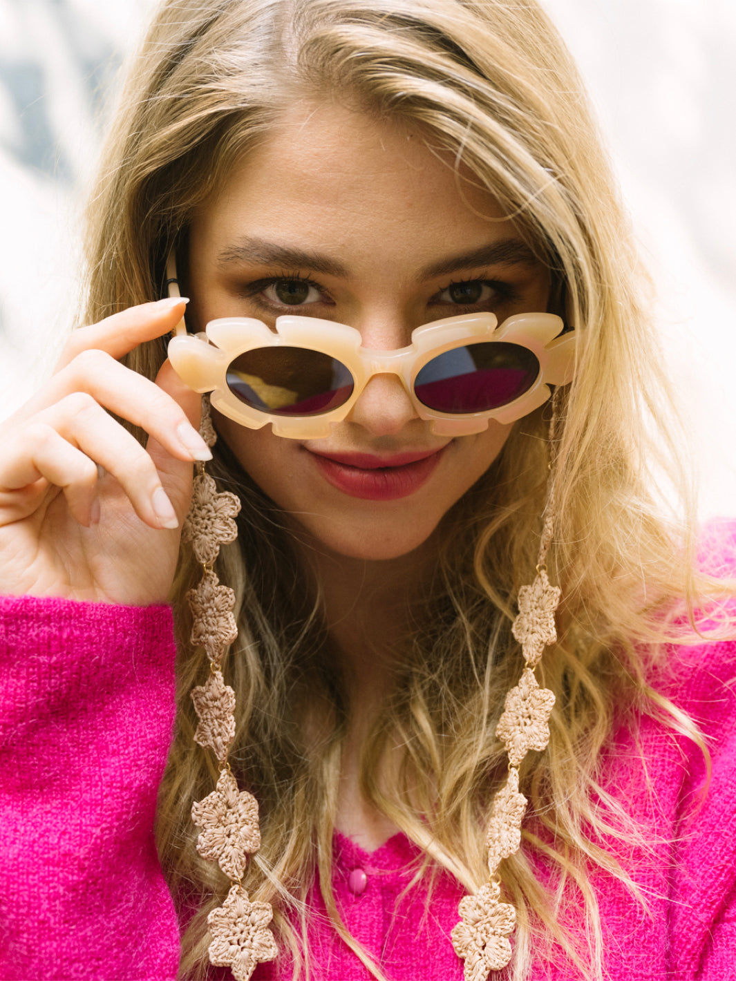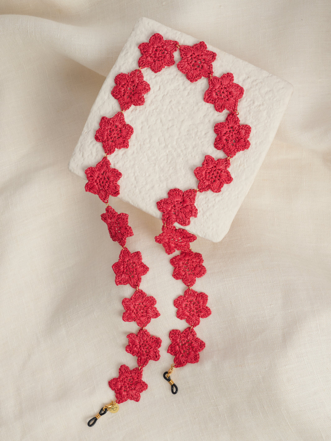 Lolita is jouw fleurige favoriet! Dit handgemaakte brillenkoord van gevlochten bloemetjes is een echte blikvanger. Licht, zacht en verkrijgbaar in framboos, blauw of beige. Perfect om je bril op te fleuren of cadeau te geven – verpakt in een mooi katoenen zakje.