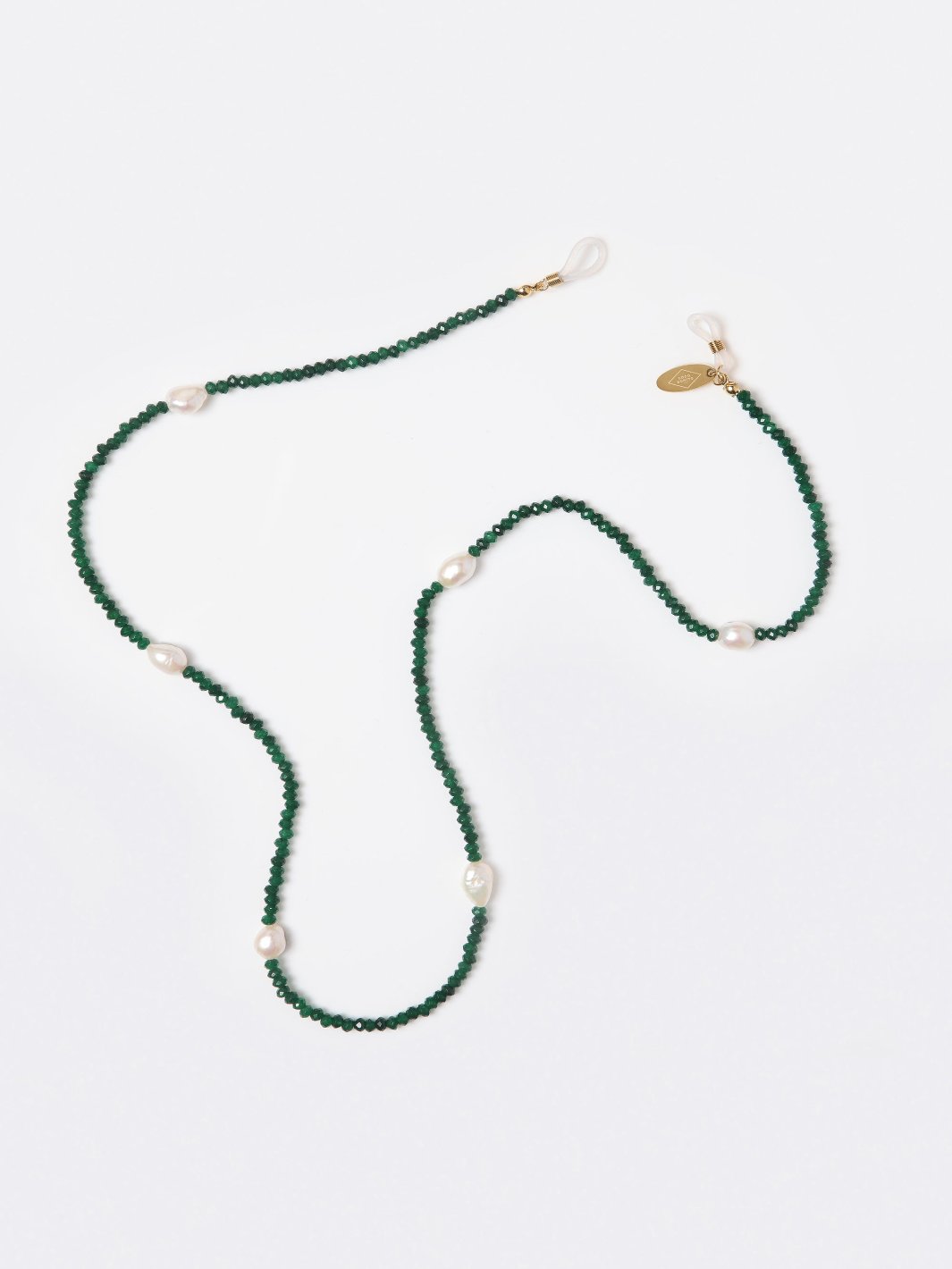 Het koordje is gemaakt van natuurlijke donkergroene kralen en natuurlijke parels.