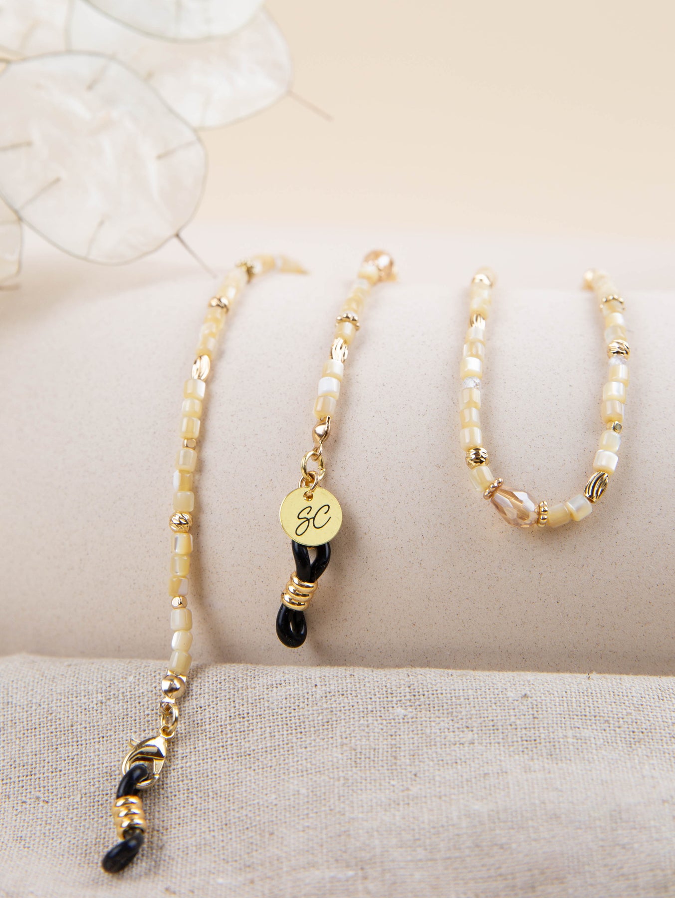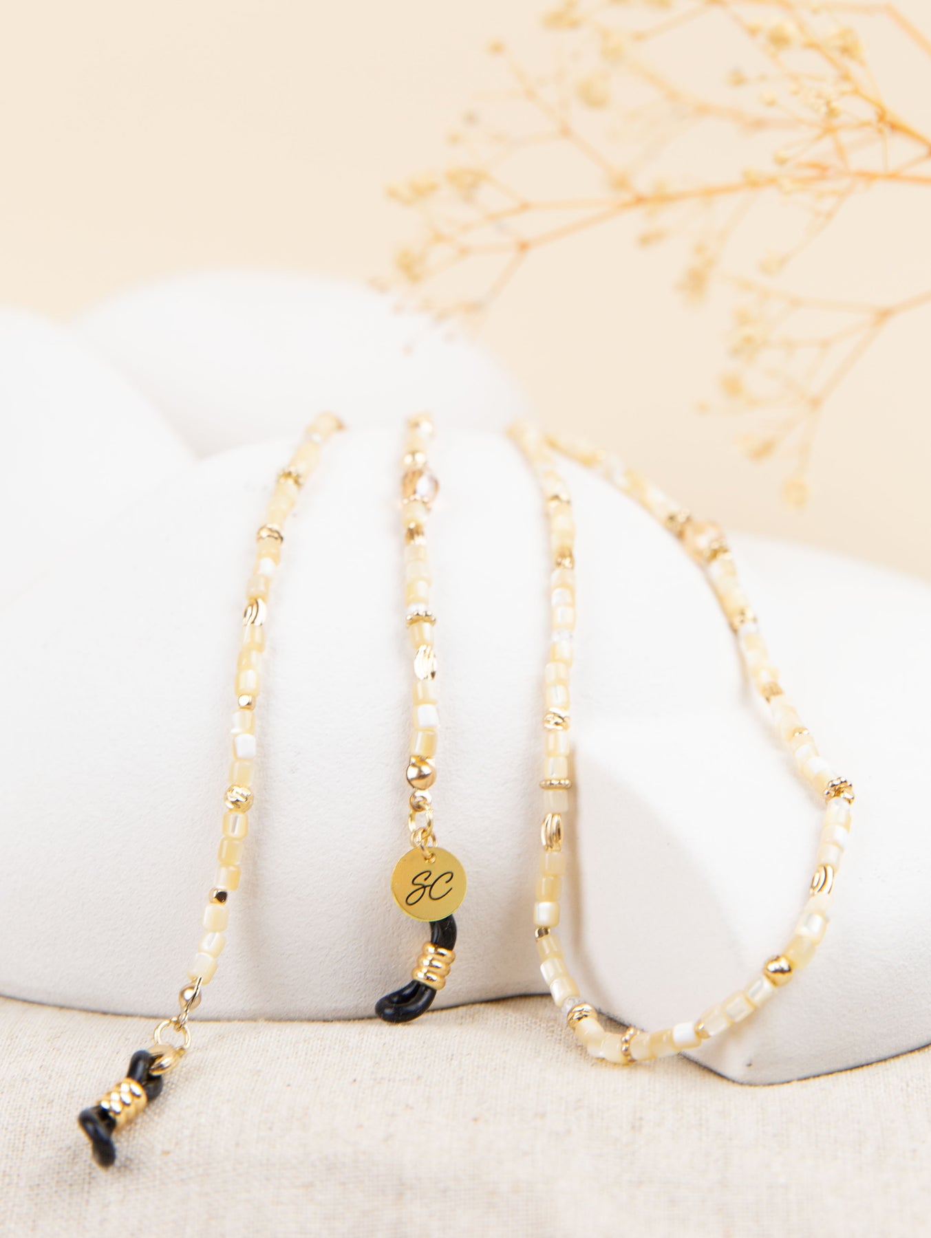 Maak kennis met de zonnebrilkoord Mae. Vrij en blij wandelen op het strand, dat onoverwinnelijke gevoel ervaren met de Mae Sunny Cord om je nek. De beige schelpkleurige stenen geven je strandoutfit een gouden, luxe uitstraling. Dit koord is niet alleen te gebruiken als brillenkoord, klik de rubberen uiteinden los en draag het als een armband om je pols.