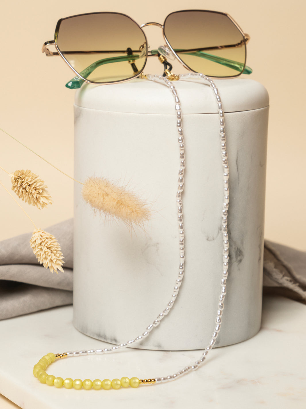 Laat je betoveren door de schoonheid van de Sky zonnebril koord. De Sky bestaat uit een samengestelde collectie van kleine imitatie parels en super polaris kralen. Deze zonnebrilkoord is gemaakt van hoge kwaliteit en met de grootste zorg en precisie zijn geselecteerd voor hun uiterlijk en glans. We hebben deze variant in drie kleuren gemaakt: blushing perzik, jeans blauw of limoen geel. Welke wordt jouw favoriet om te shoppen?
