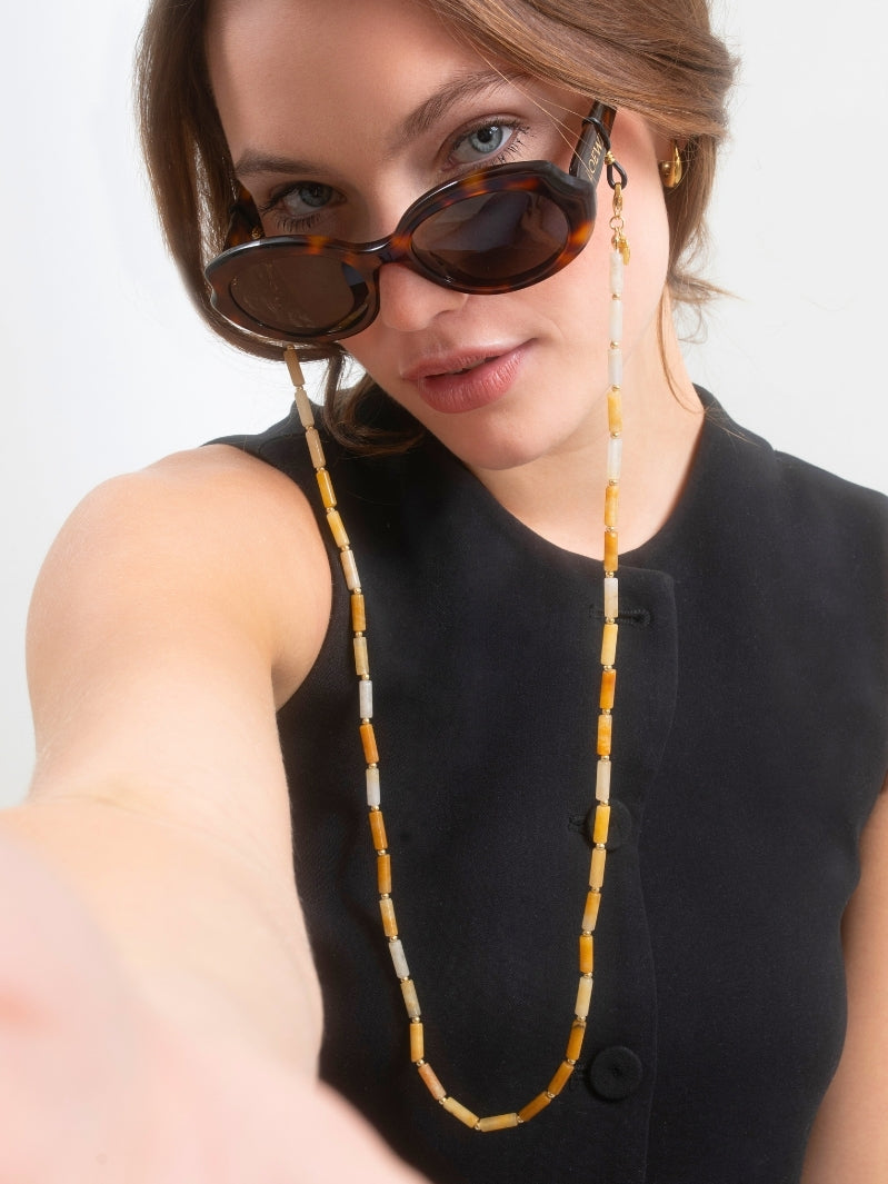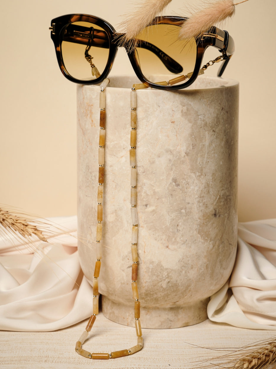 Breng natuurlijke elegantie in je stijl met het Wendy brillenkoord van Sunny Cords. De combinatie van natuurlijke kegeltjes, schijfjes en DQ-gouden kralen geeft dit zonnebrilkoord een zachte, beige uitstraling. Ideaal voor wie houdt van subtiele, organische luxe.