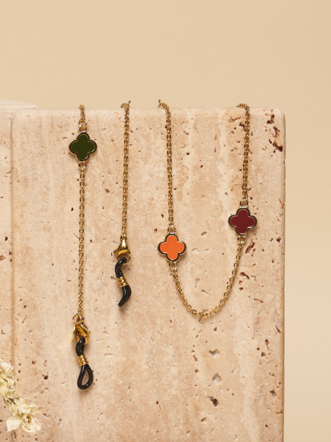 Maak kennis met onze nieuwste Sunny Cord Ruby, de klassieke goud variant met een extra touch. De brillenkoord heeft een subtiele gouden chain met bloemvormige bedels, verkrijgbaar in goud of met verschillende warmen kleuren. De Ruby is klassiek maar geeft net die extra touch aan je outfit. De Ruby kan ook gedragen worden als ketting of armband, clip de rubbers eruit en tover hem om tot een uniek sieraad. Geen fan van de colour? Goed nieuws, want de Ruby komt in verschillende variaties: Ruby, parel, zwart en air. Welke je ook kiest, het zal de juiste voor jou zijn! verschillende variaties: