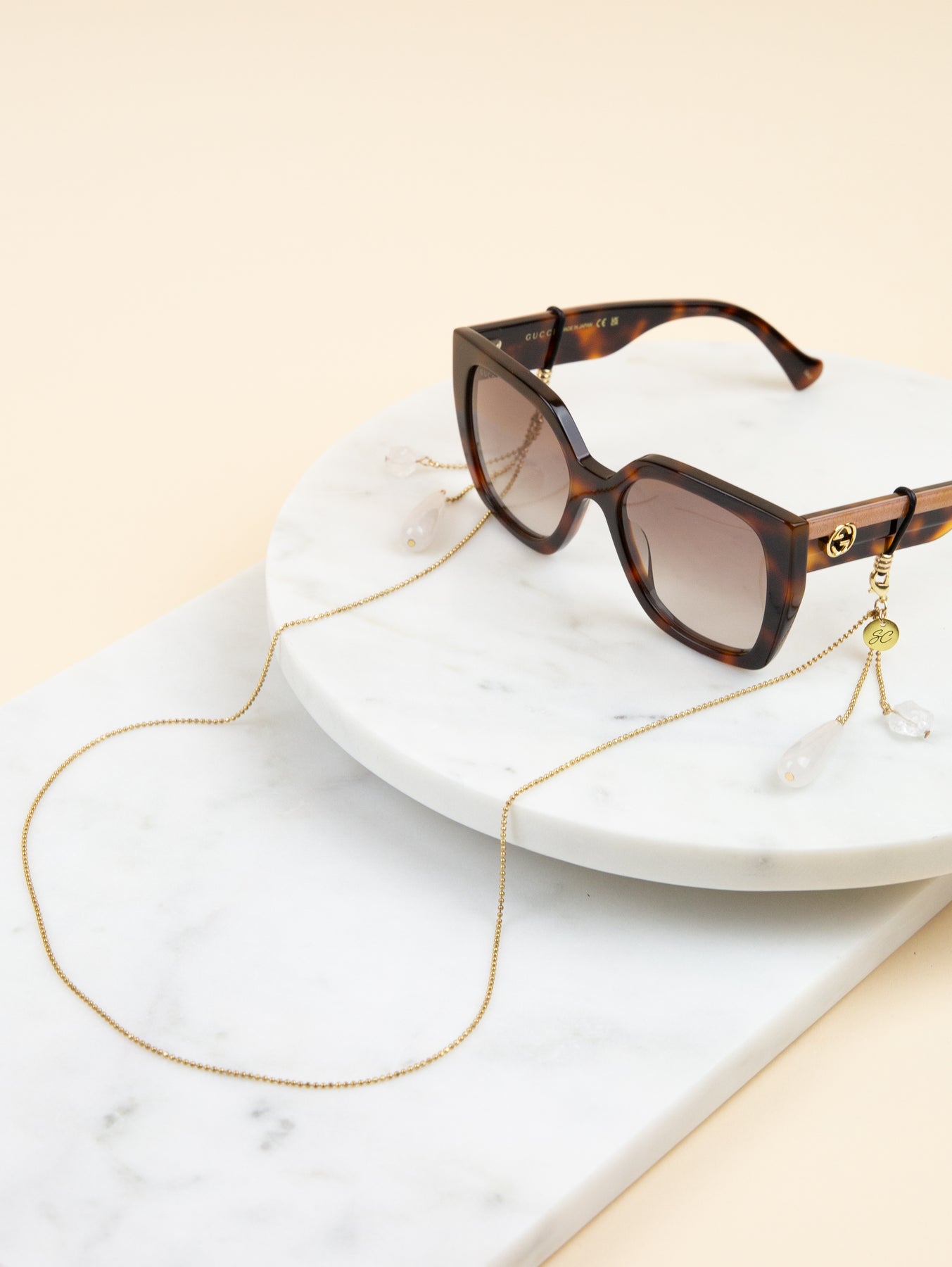 Het Gigi zonnebrilkoord is geïnspireerd door jou! Een geliefde klant zocht naar een Sunny Cord die de indruk wekt dat je ook oorbellen draagt, en Gigi voldoet aan al die verwachtingen. De 2 kristal witte natuurstenen zorgen voor een tijdloze look. Bevestig dit sieraad aan je bril en je bent all set voor jou jewellery party!