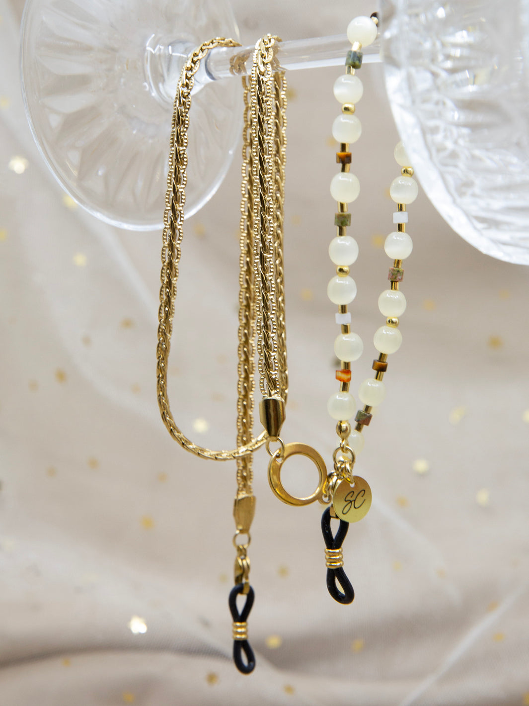 Stap in de betoverende wereld van Maeve, een sprankelende zonnebrilkoord gemaakt van luxe super polaris kralen in combinatie met een gevlochten RVS gouden chain. Maeve betekent "betoverend", en dat is precies wat deze brillenkoord uitstraalt. Het sprankelende en elegante ontwerp wordt gecombineerd met een gevarieerd kleurenpalet van luxe kralen, waardoor dit sieraad een unieke en stijlvolle uitstraling heeft.