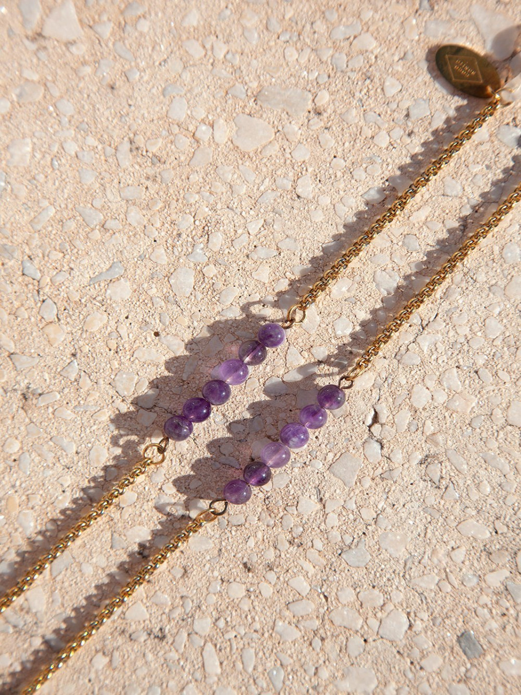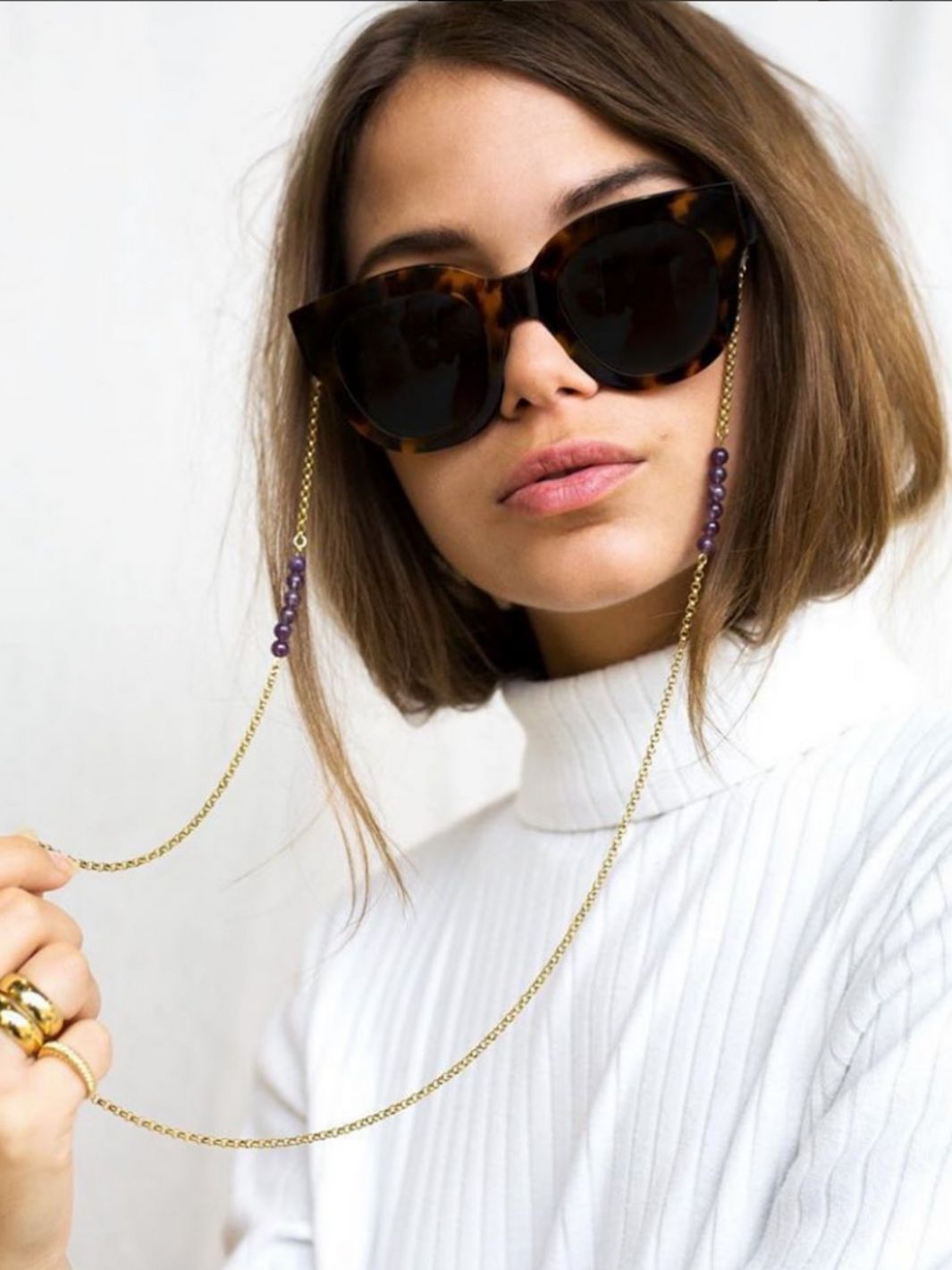 De Violet Bliss Sunnycord is het paarse zusje van de Missy Pearl & Berry Brown Sunnycord. Ze is eenvoudig, maar valt op door de paarse edelstenen die elegant langs je gezicht hangen. Dit koordje staat prachtig bij zowel zonnebrillen als leesbrillen.