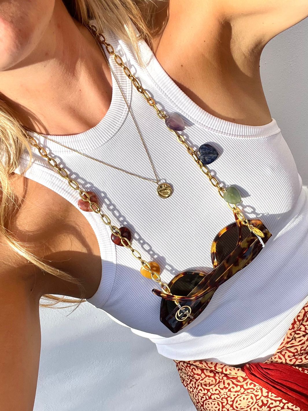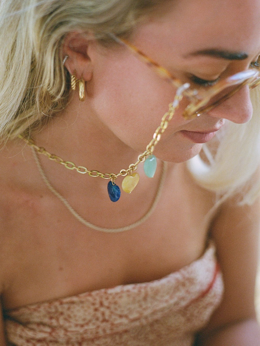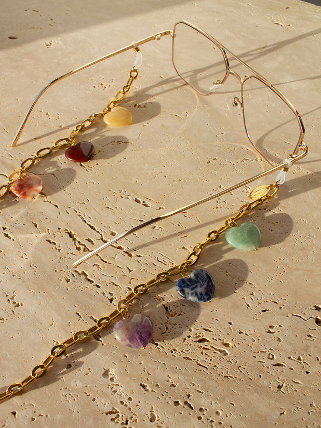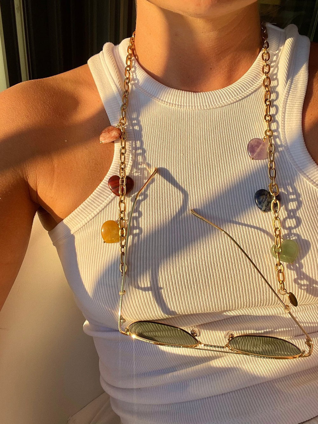Maak kennis met onze zomerfavoriet: de Paloma Hearts XS edelstenen brillenkoord! Deze Sunnycord® is gemaakt van een 18K goud vergulde ketting en is versierd met zes verschillende gekleurde edelstenen. Met zijn unieke design is deze beauty de perfecte accessoire om je zomerse look helemaal af te maken.
