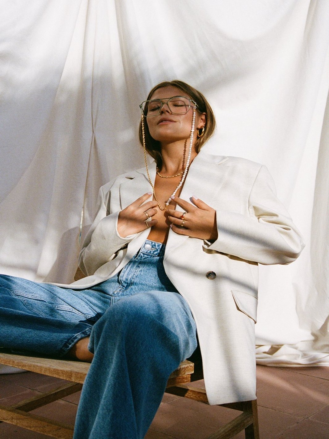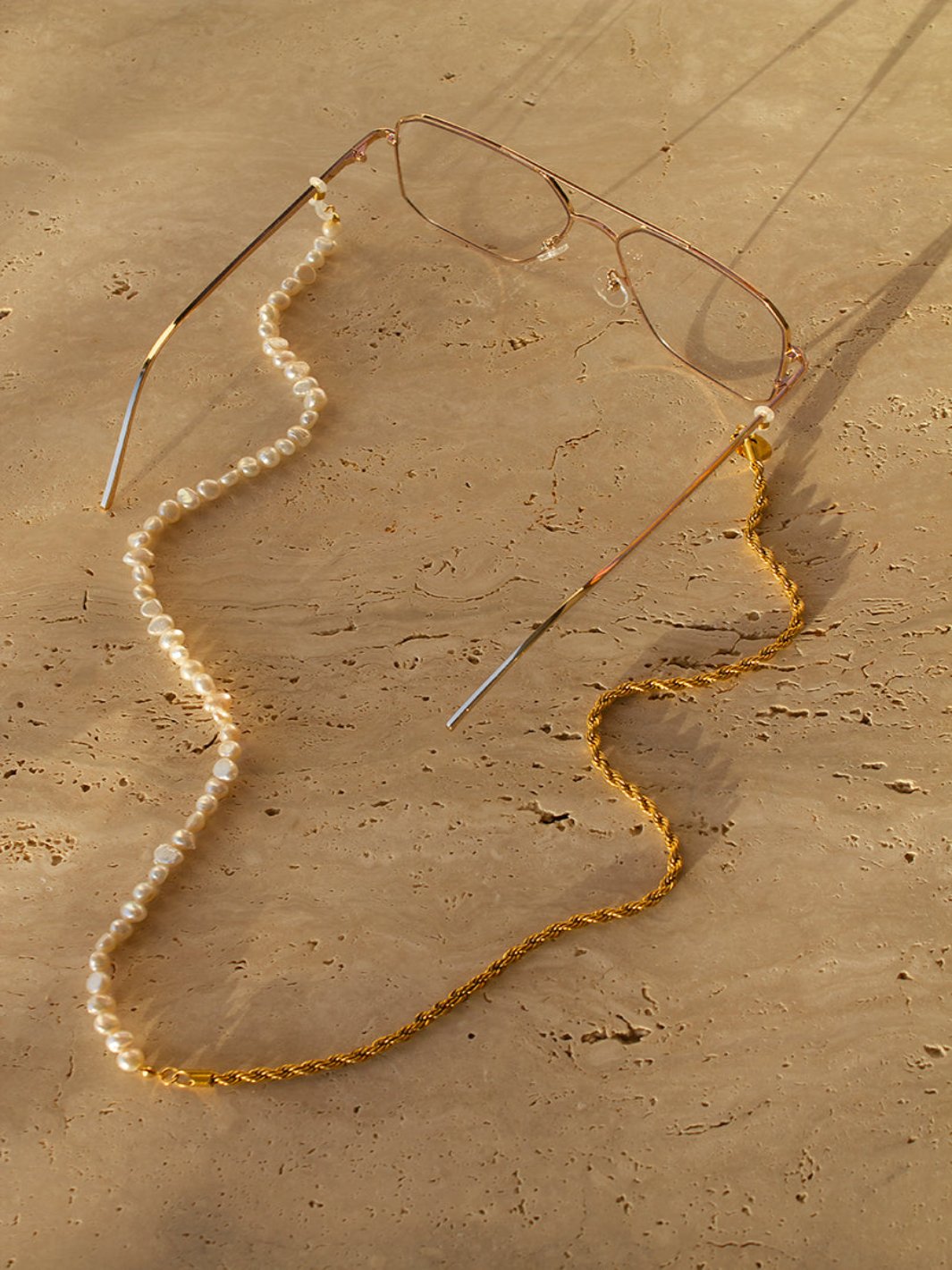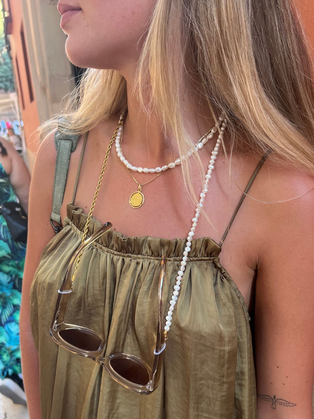 De Two Faced ketting is vernoemd naar haar a-symmetrische ontwerp. Dit speciale brillenkoord heeft twee verschillende kanten, gemaakt van een gouden ketting en barokparels. Deze twee verschillende kanten geven het zonnige koord zo'n edgy effect. Durf het te dragen en val op!
