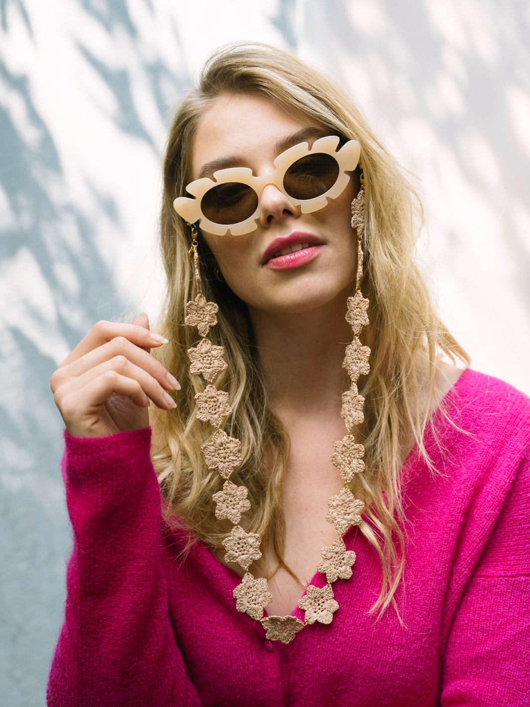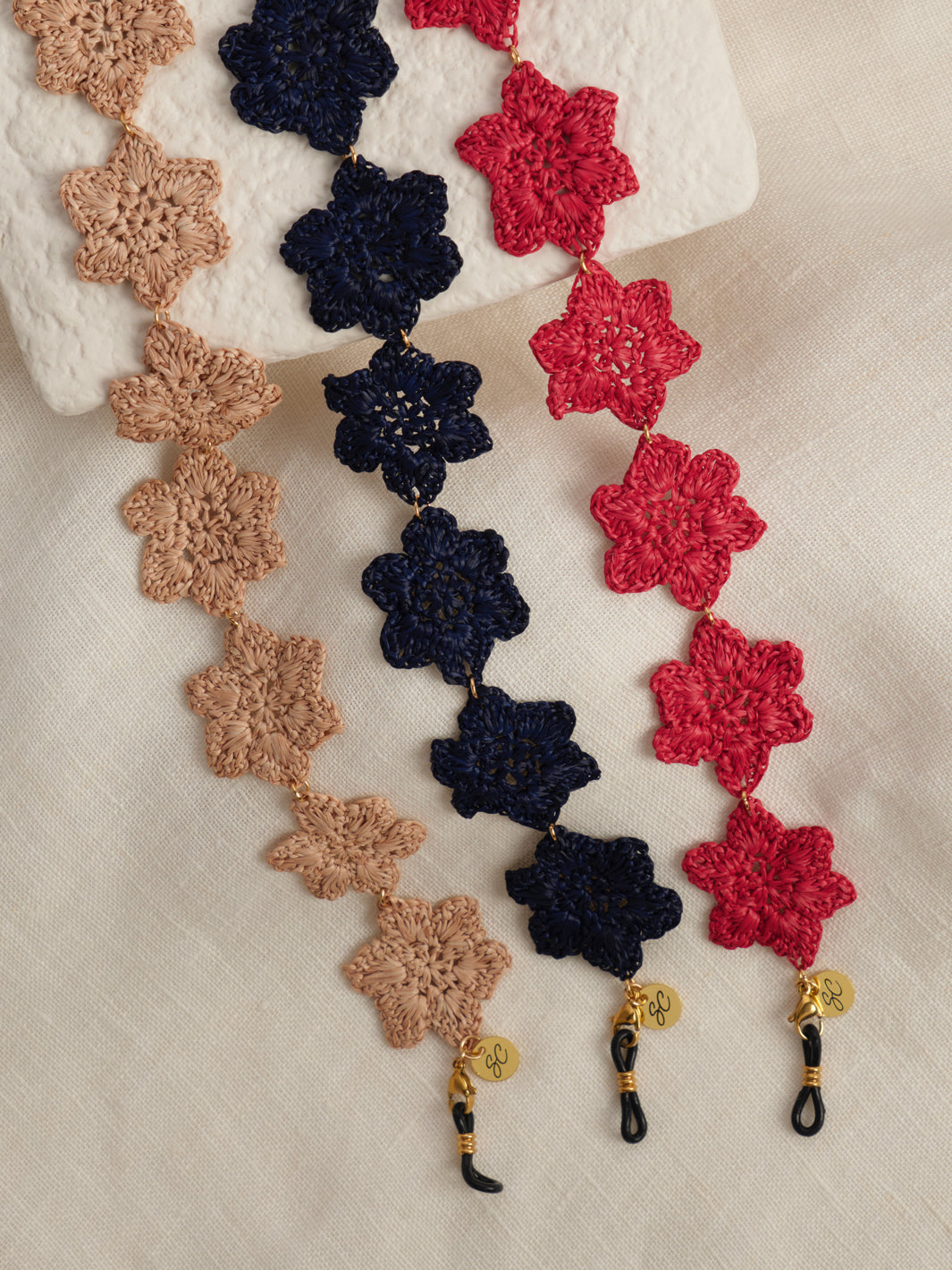 Lolita is jouw fleurige favoriet! Dit handgemaakte brillenkoord van gevlochten bloemetjes is een echte blikvanger. Licht, zacht en verkrijgbaar in framboos, blauw of beige. Perfect om je bril op te fleuren of cadeau te geven – verpakt in een mooi katoenen zakje.