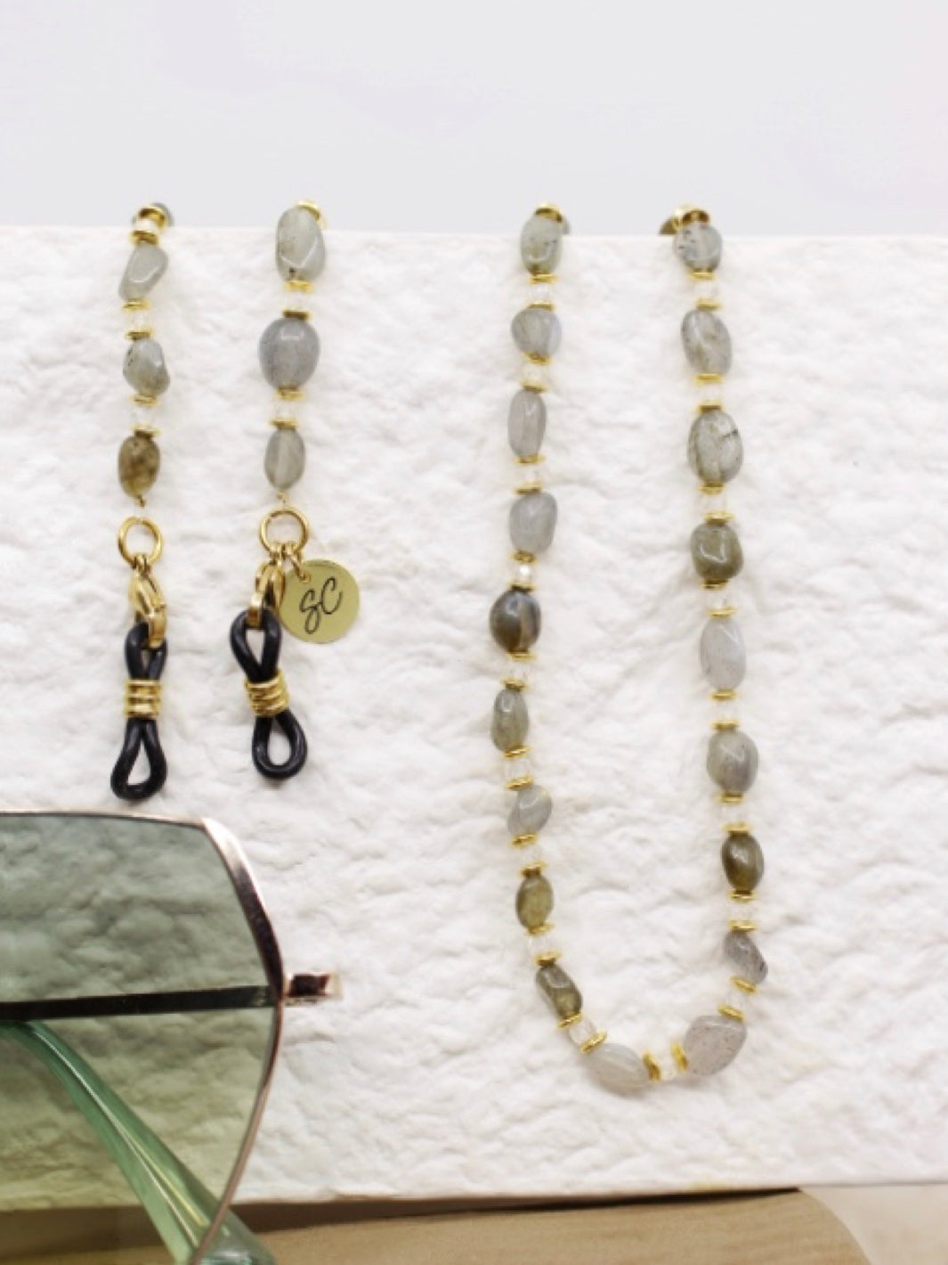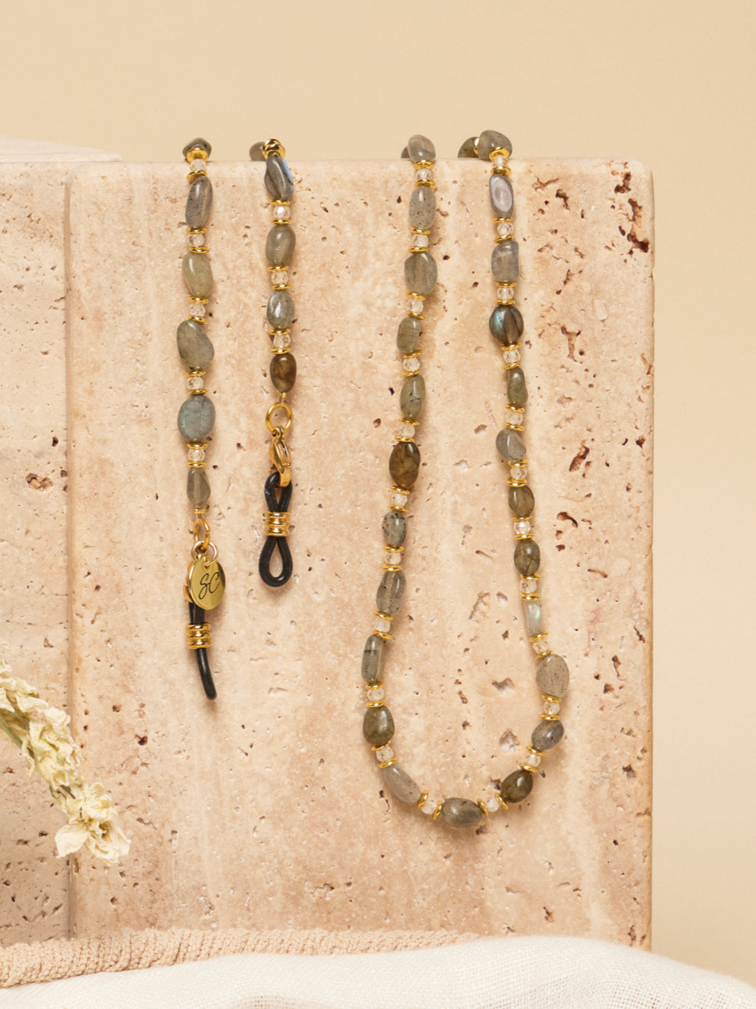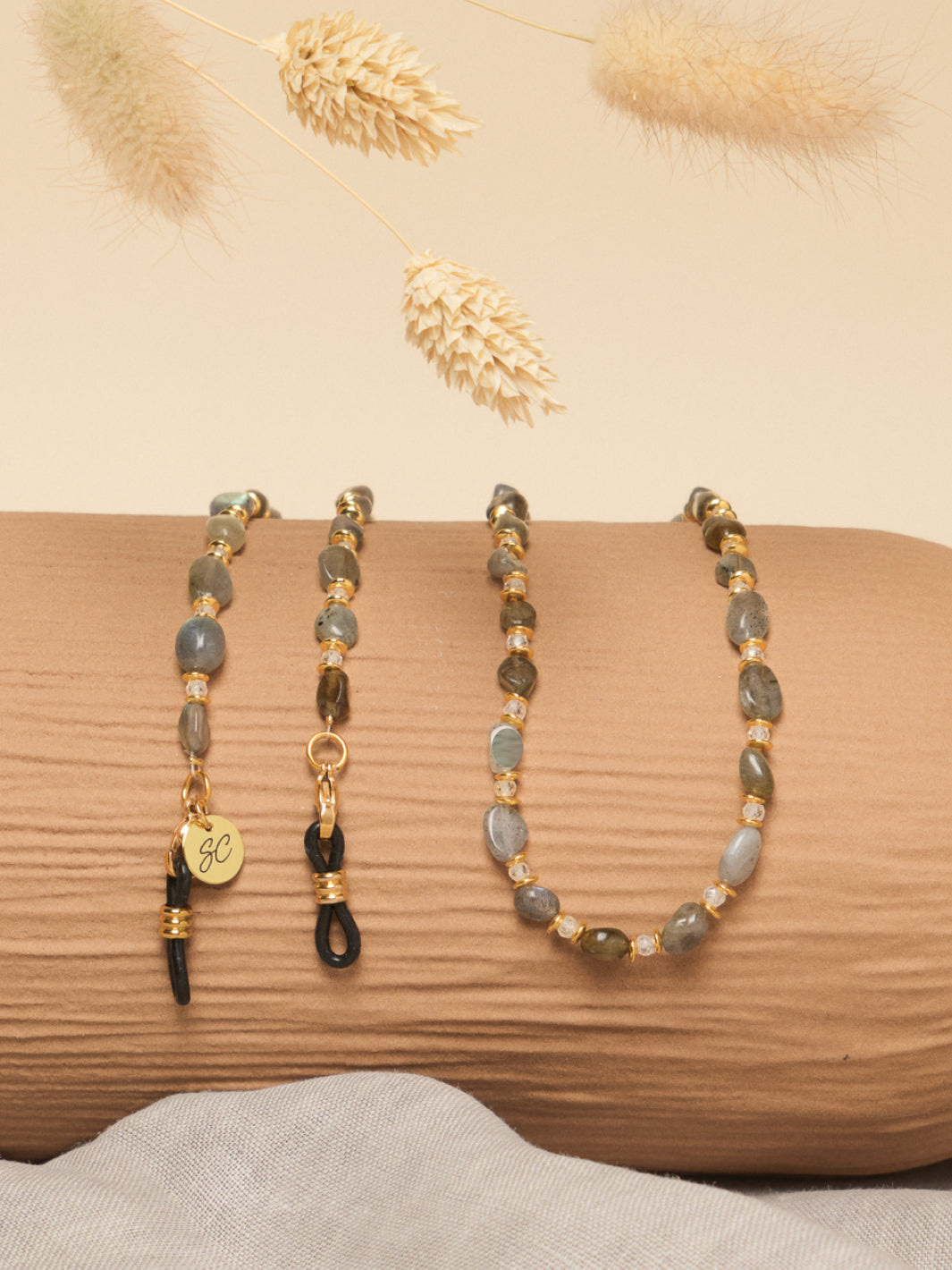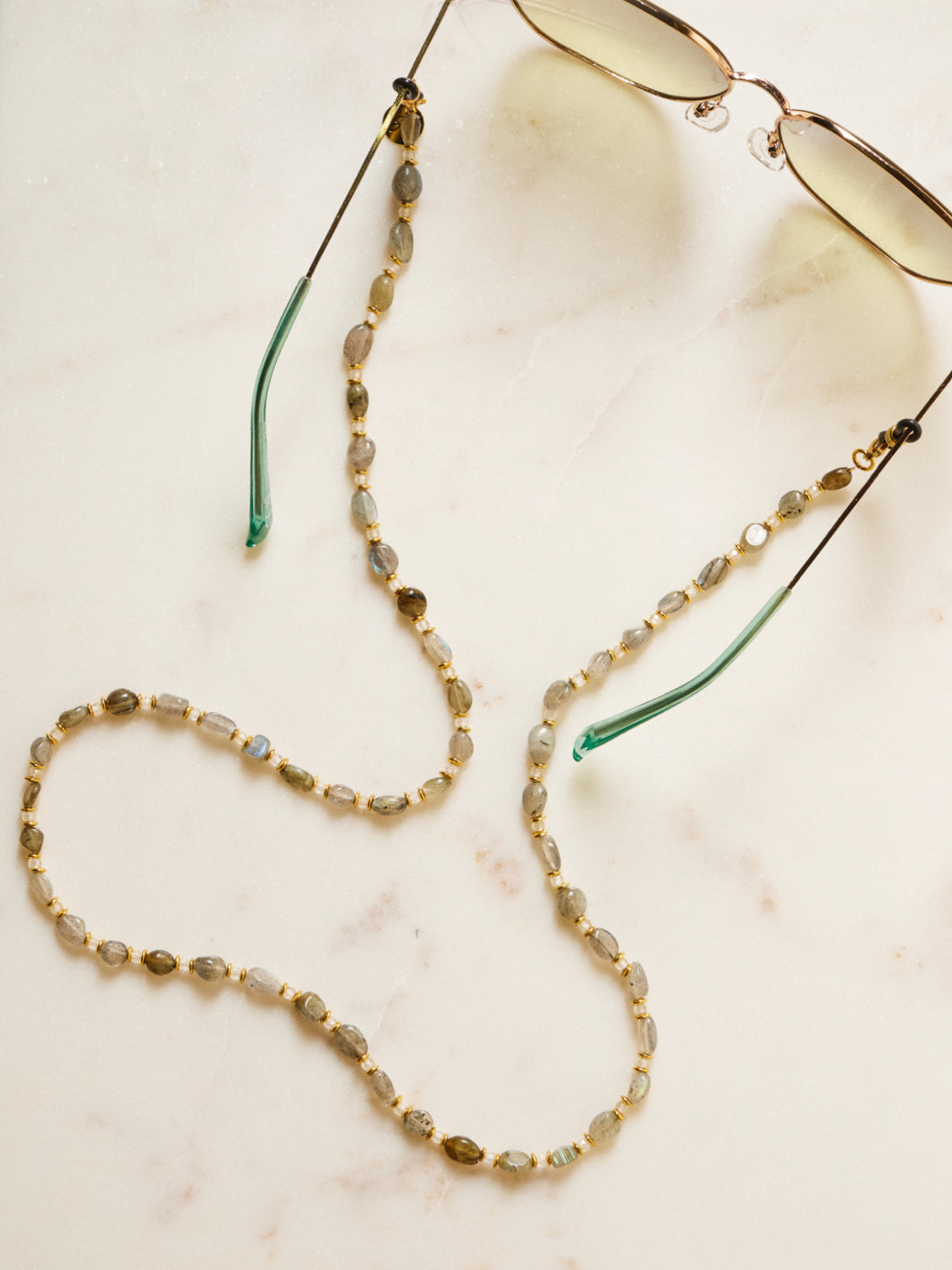 Maak kennis met brillenkoord River een zacht natuurlijk ontwerp geïnspireerd op de natuur elementen en doorzichtige Zirkonia kralen. Met een elegante, verfijnde stijl en een ontwerp dat onvergetelijke indrukken maakt, is deze zonnebrilkoord het perfecte sieraad voor elke gelegenheid.