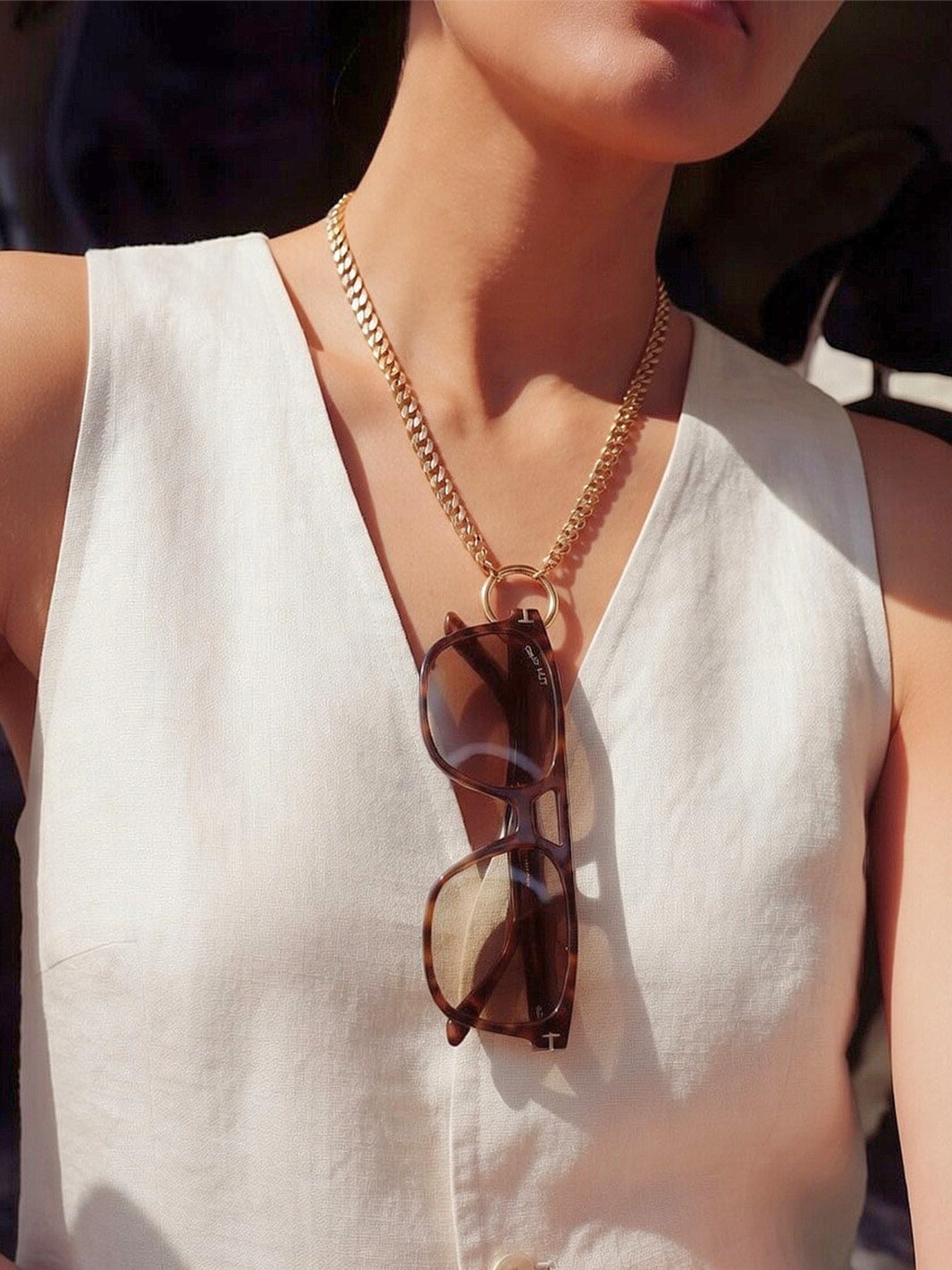 De Samantha brillenketting is minimalistisch en verfijnd. Een 18K vergulde ketting met ring die je bril elegant op zijn plaats houdt. De 18 mm opening past op vrijwel alle monturen – stijlvol en functioneel tegelijk.
