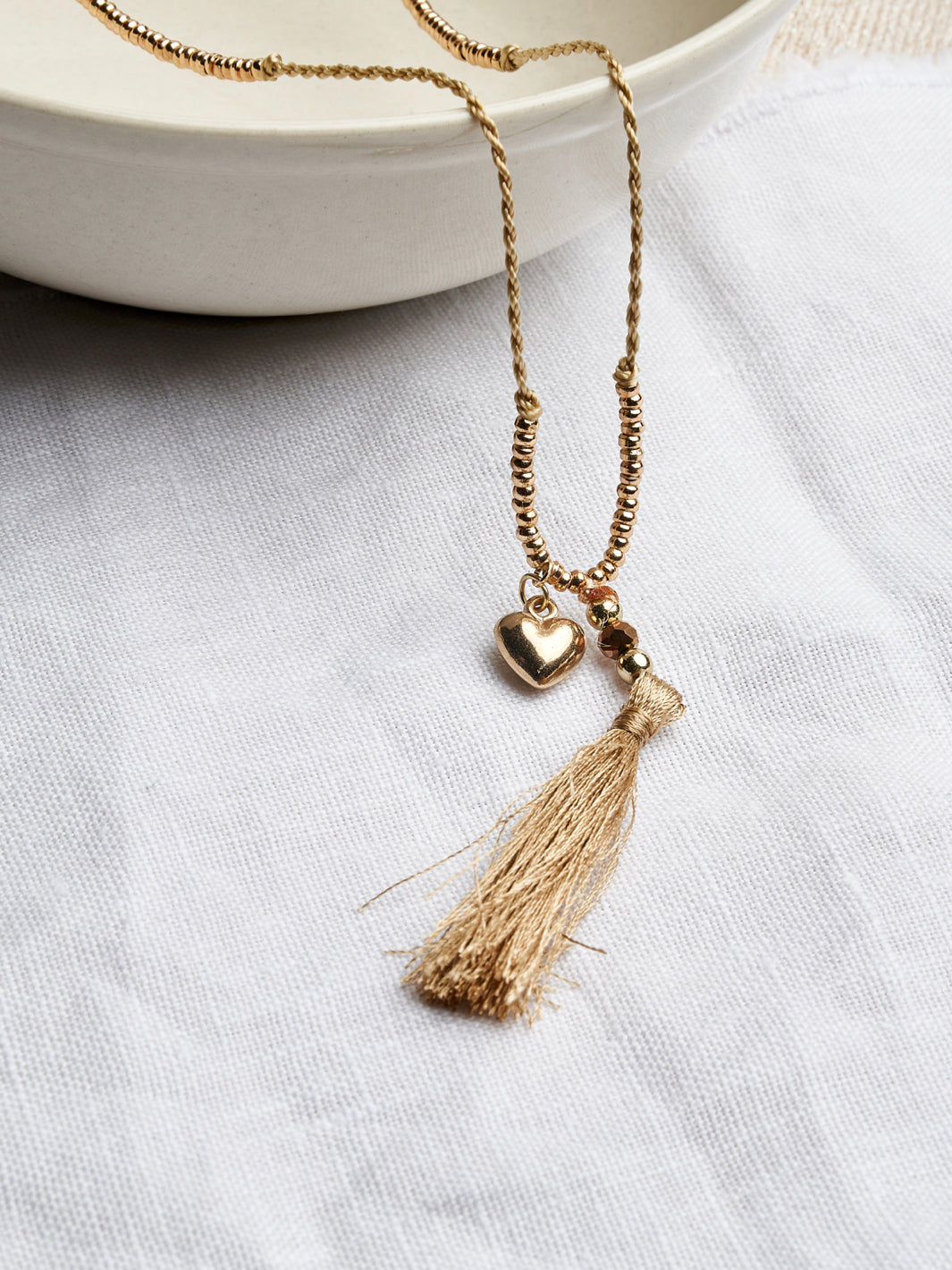 De 'McTassel' is een bohemian geïnspireerd zonnebrilkoordje en helemaal trendy voor deze zomer! Een delicaat kwastje en een goud hartje, geven deze hippe brillenkoord een speelse toevoeging op je rug. Alle materialen voor dit brillenkoordje zijn geïmporteerd uit een magische klein plaatsje op Bali. Shine als nooit te voren met deze trendy brillenkoord!